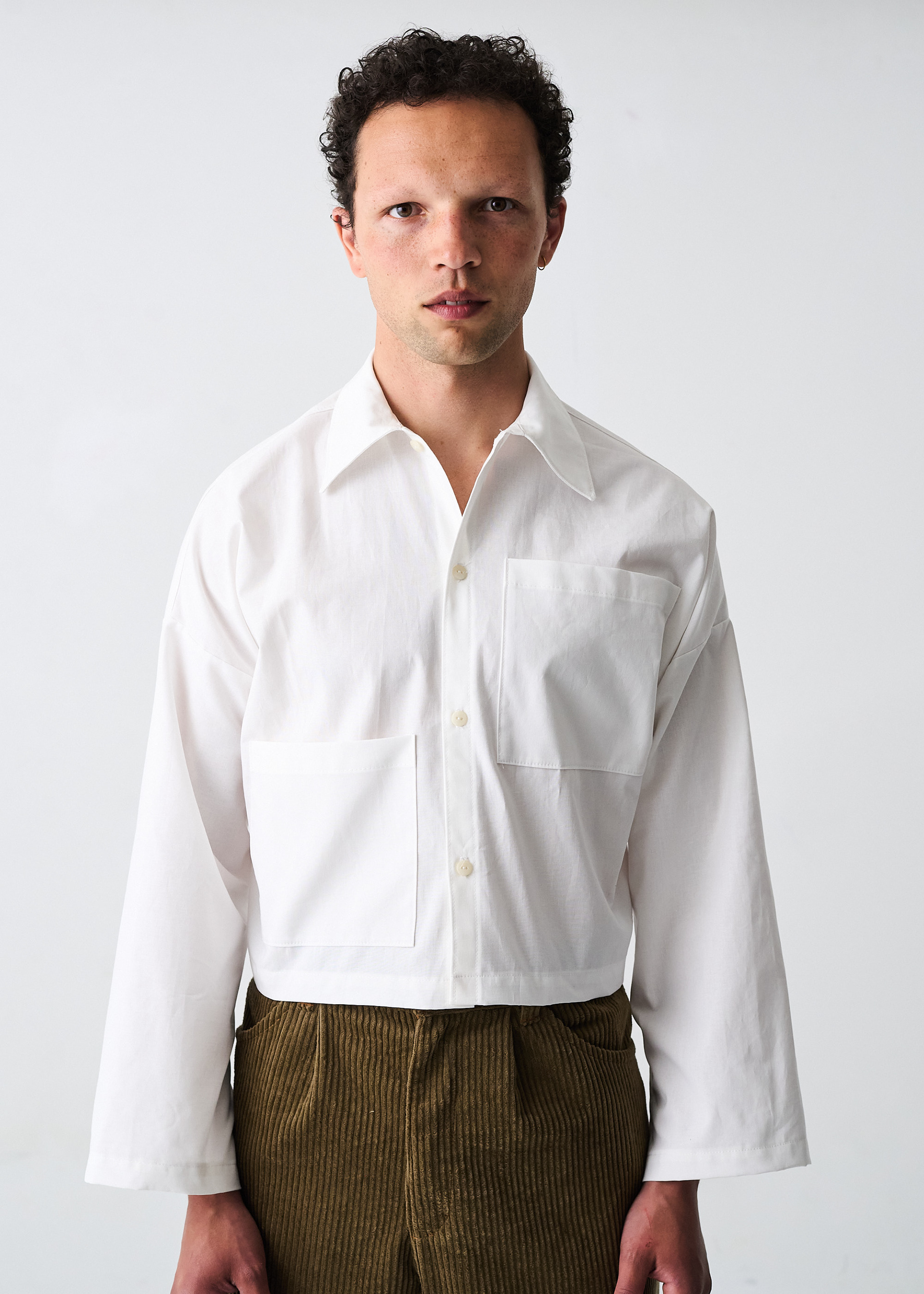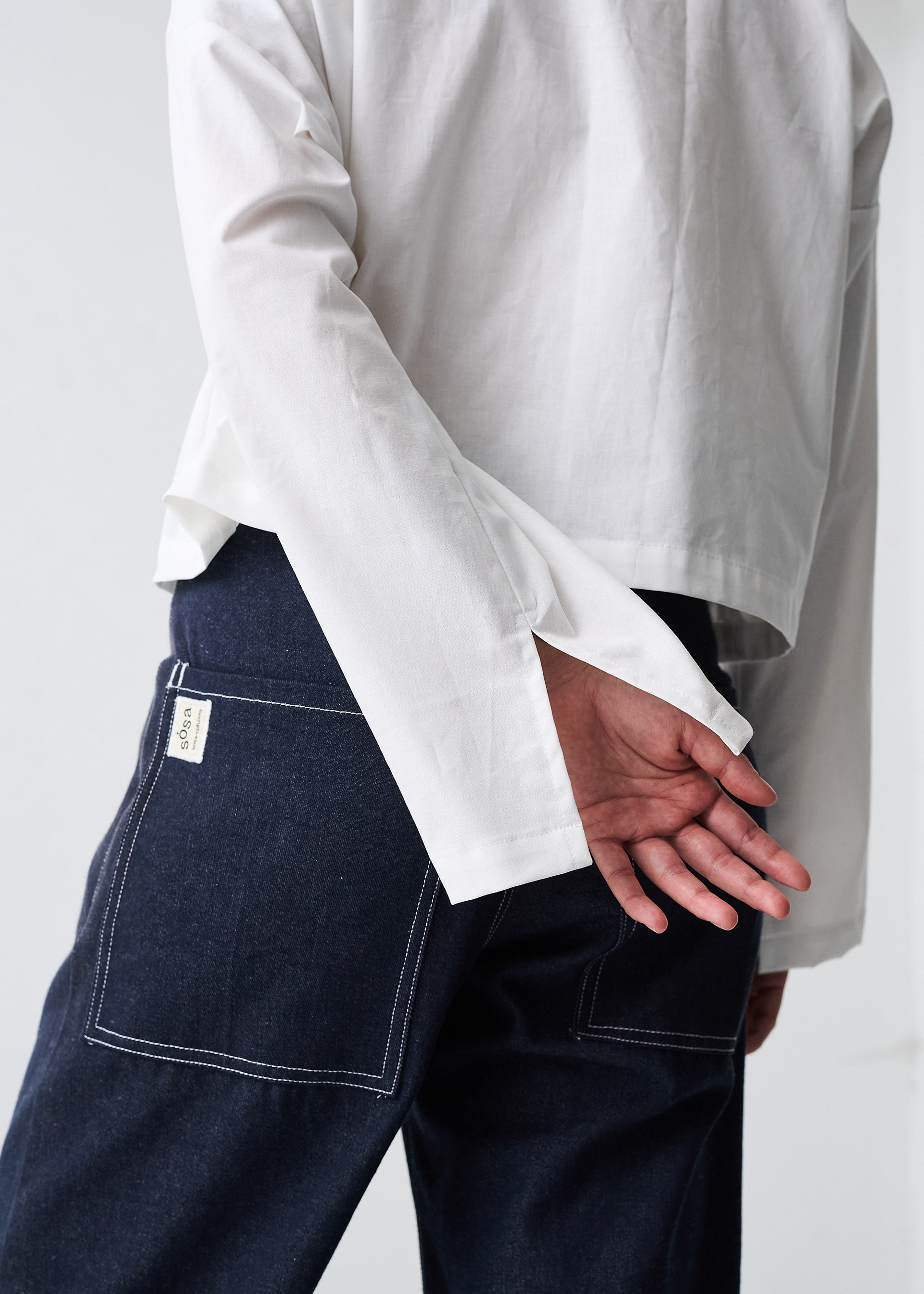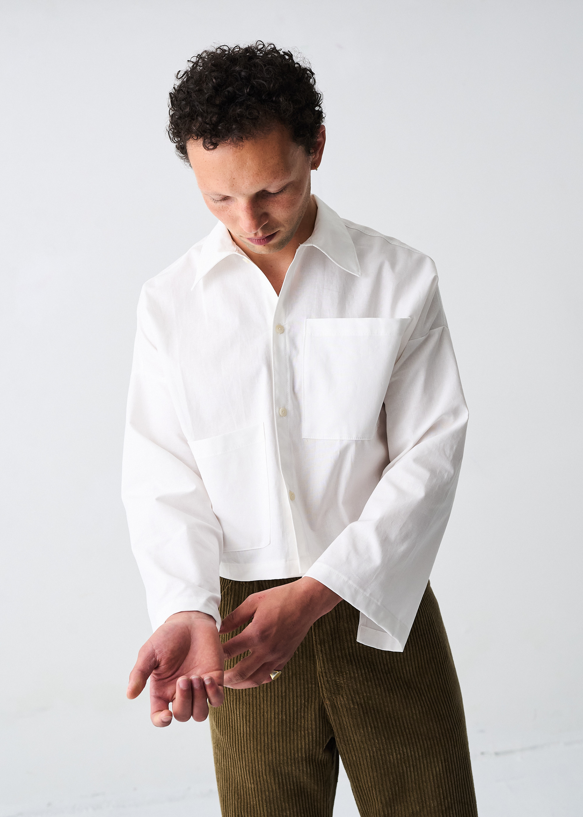 unisex relaxed boxy fit with zig zag pockets and slid sleeves made from deadstock organic cotton 1500 DKK / 200 EUR